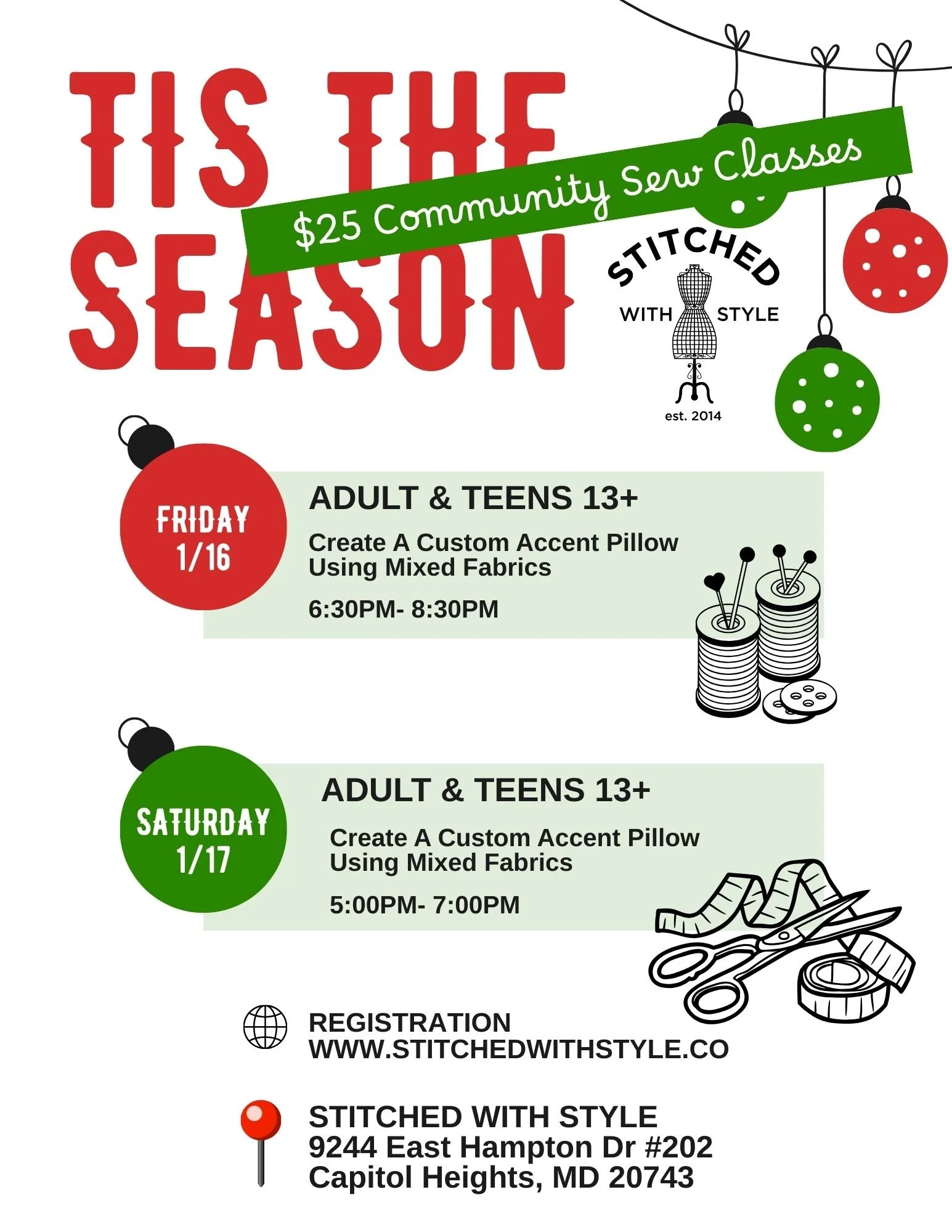 We are so excited to announce our community sew initiative. Black Friday weekend we will offer a discounted workshop with all supplies included for teens and adults. Join us at the "Stitched With Style" sewing studio for an evening of gaining new skills, and enjoying fellowship. If you are brand new to sewing or have experience but need an evening of creativity this workshop is for you. Sign up with friends and family...